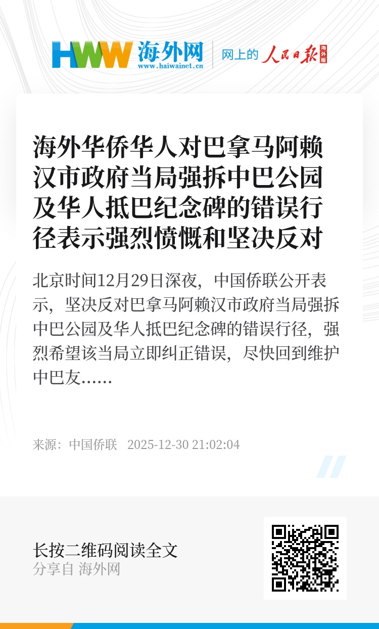 北京时间12月29日深夜,中国侨联公开表示,坚决反对巴拿马阿赖汉市政府当局强拆中巴公园及华人抵巴纪念碑的错误行径,强烈希望该当局立即纠正错误,尽快回到维护中巴友谊的正确道路上来。一时间,引发海外华侨华人对中巴公园及华人抵巴纪念碑遭强拆事件的严重关切,对阿赖汉市政府当局这一错误行径纷纷表示强烈愤慨和坚决反对。