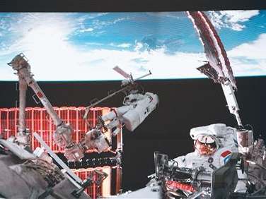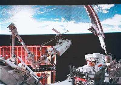 12月9日在北京航天飞行控制中心屏幕上拍摄的神舟二十一号乘组航天员张陆与武飞(右)在舱外工作的画面。新华社记者 刘 艺摄