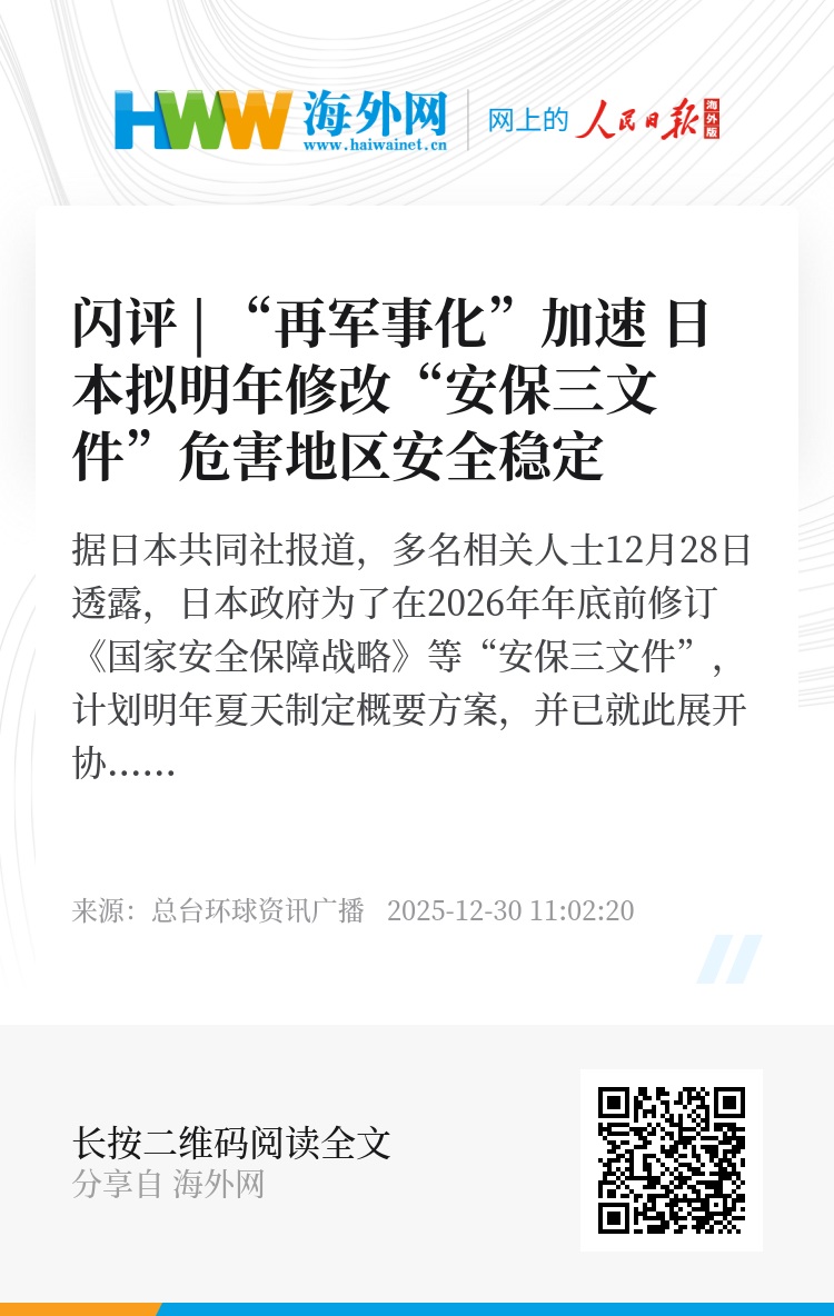 据日本共同社报道,多名相关人士12月28日透露,日本政府为了在2026年年底前修订《国家安全保障战略》等“安保三文件”,计划明年夏天制定概要方案,并已就此展开协调。据报道,概要方案将汇总关于太平洋防卫的方式、利用无人机的新战斗方法等构想,还可能公布增加防卫费的数值目标。日本高市早苗政府上台后,不断加快扩武强军步伐。此次拟修订“安保三文件”,日本政府计划达成什么战略意图?日本在高市政权下将走向何方?