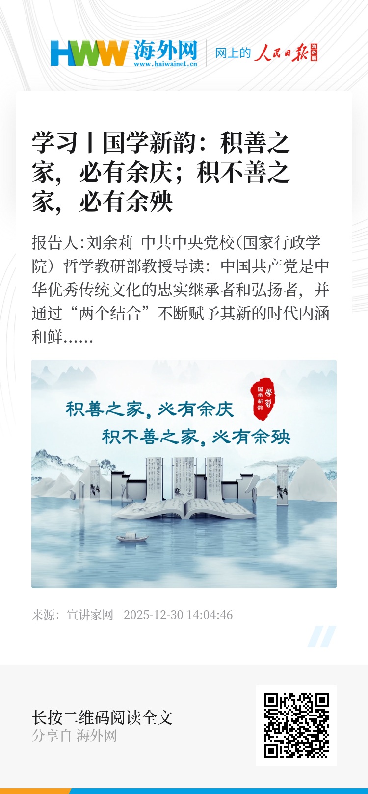 中国共产党是中华优秀传统文化的忠实继承者和弘扬者,并通过“两个结合”不断赋予其新的时代内涵和鲜活当代价值。习近平主席多次在重要讲话和文章中引用古典名句,寓意深邃,生动传神,闪耀着中华优秀传统文化博大精深的智慧光芒,极具启迪意义。本期节目,中共中央党校(国家行政学院)哲学教研部教授刘余莉从习近平主席引用的“积善之家,必有余庆;积不善之家,必有余殃”切入,为我们讲解这一诗句的核心内涵与当代启示,并进一步探讨为什么要加强党的作风建设的问题。欢迎观看。