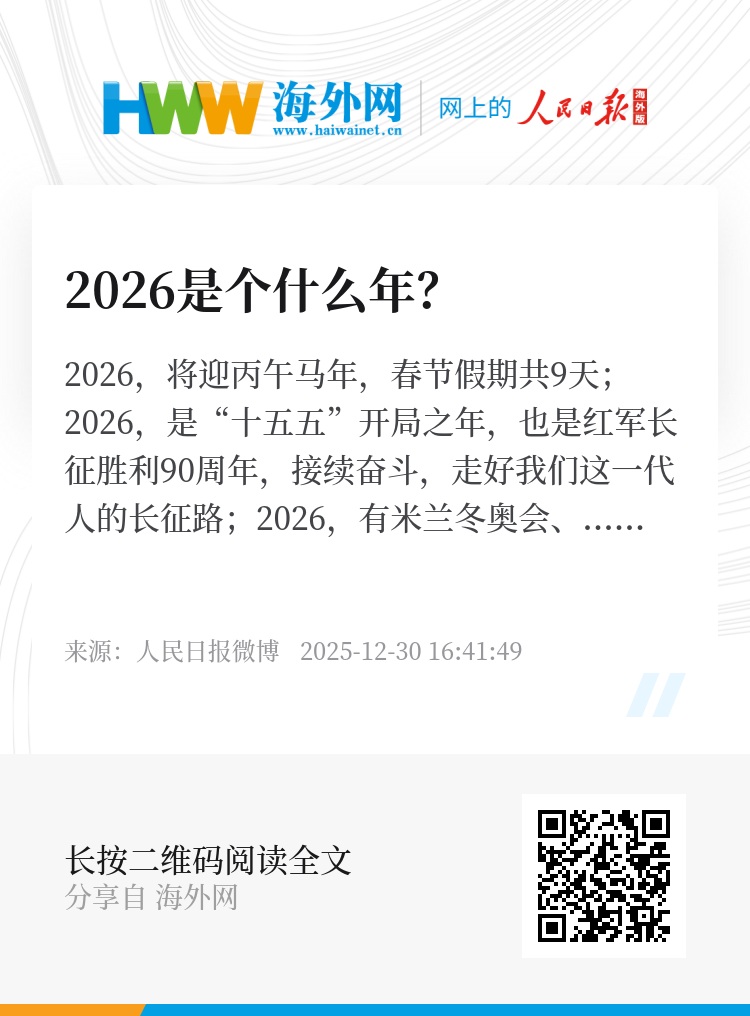 2026,将迎丙午马年,春节假期共9天;2026,是“十五五”开局之年,也是红军长征胜利90周年,接续奋斗,走好我们这一代人的长征路;2026,有米兰冬奥会、美加墨世界杯,为拼搏和热爱喝彩。每一个人都是主角,新的一年,也会是我们的成长年。2026年度预告片,收藏,期待!