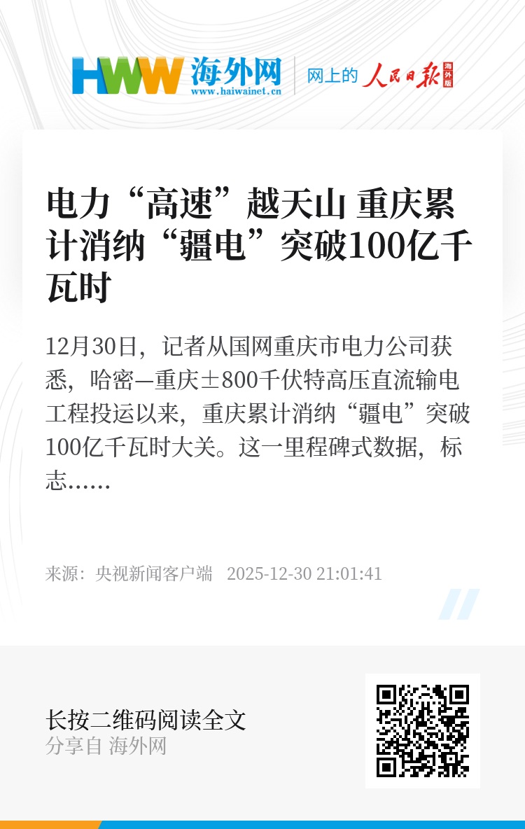 百亿千瓦时“疆电”的平稳消纳,有效破解了重庆“贫煤少水无油”的能源禀赋困境。今年夏季,外电入渝首次突破1000万千瓦,其中“疆电”成为关键支撑,助力重庆度夏实现用电供需“紧平衡”,让“缺电的夏天”成为历史。未来,“疆电入渝”工程将持续发挥区域能源互补优势,为重庆和电网高质量发展注入更充沛、更绿色的“电力血脉”。