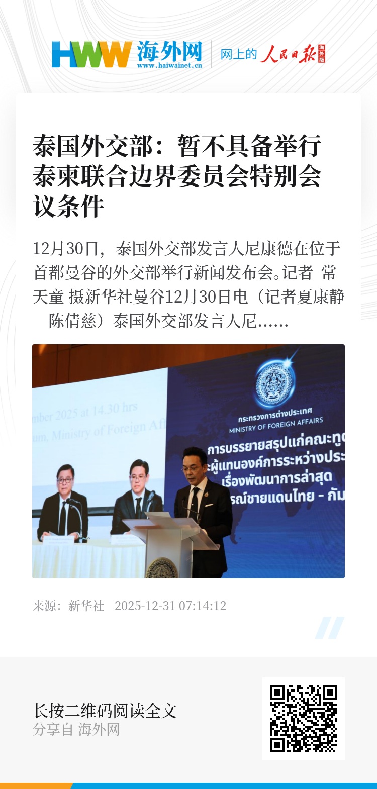 柬埔寨边境事务国务秘书处29日发布新闻稿说,柬埔寨已向泰国发出外交照会,提议于2026年1月第一周在柬埔寨暹粒省举行柬泰联合边界委员会紧急特别会议。