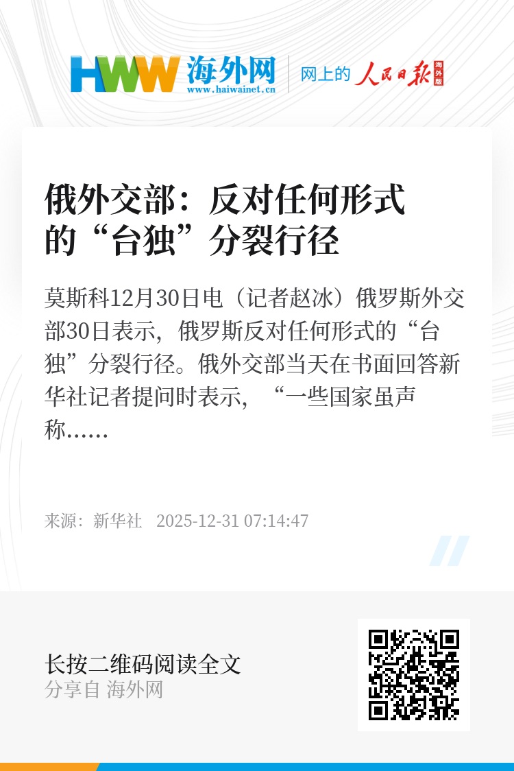 新华社莫斯科12月30日电(记者赵冰)俄罗斯外交部30日表示,俄罗斯反对任何形式的“台独”分裂行径。