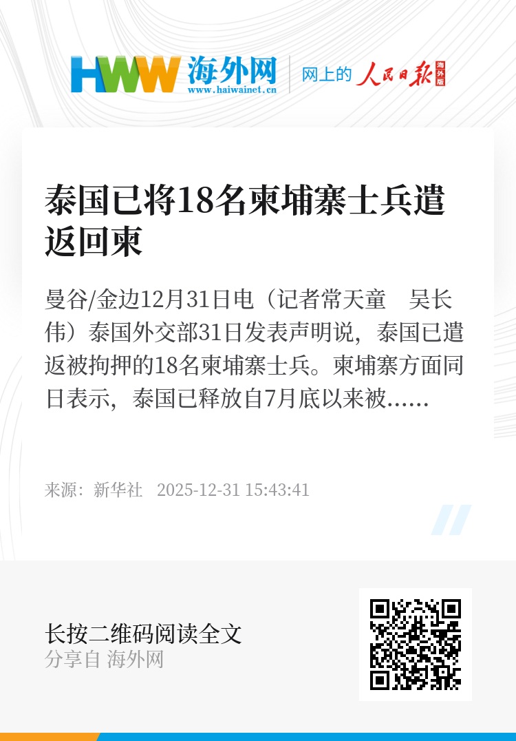 新华社曼谷/金边12月31日电(记者常天童 吴长伟)泰国外交部31日发表声明说,泰国已遣返被拘押的18名柬埔寨士兵。柬埔寨方面同日表示,泰国已释放自7月底以来被其俘虏的18名柬埔寨士兵。
