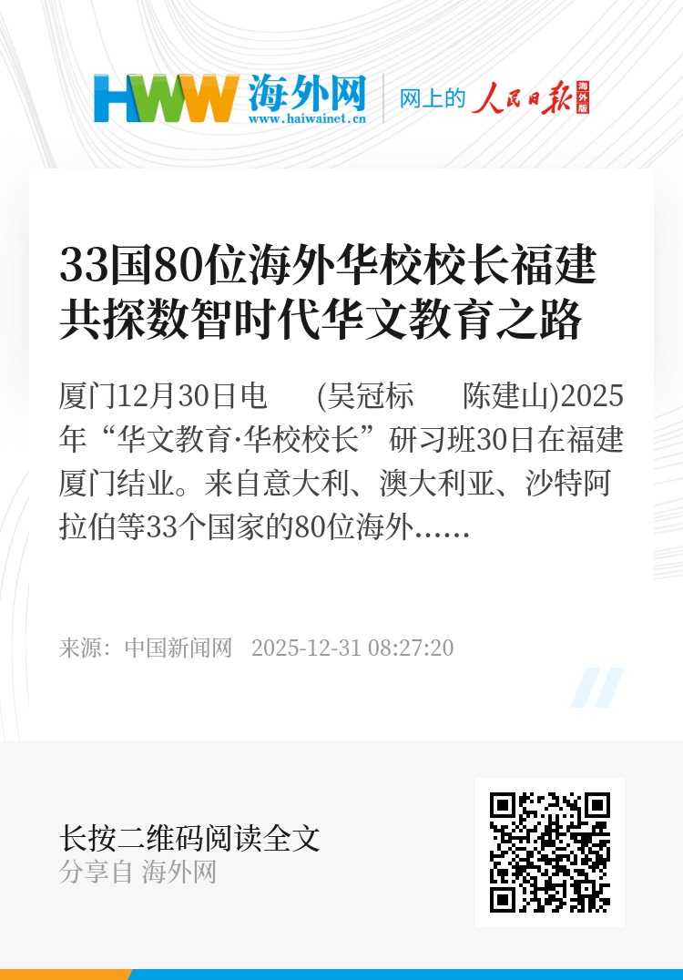 中新网厦门12月30日电 (吴冠标 陈建山)2025年“华文教育·华校校长”研习班30日在福建厦门结业。来自意大利、澳大利亚、沙特阿拉伯等33个国家的80位海外华校校长及负责人带着数智化教学工具、办学新思路与合作新契机,结束了这场华文教育交流之旅。
