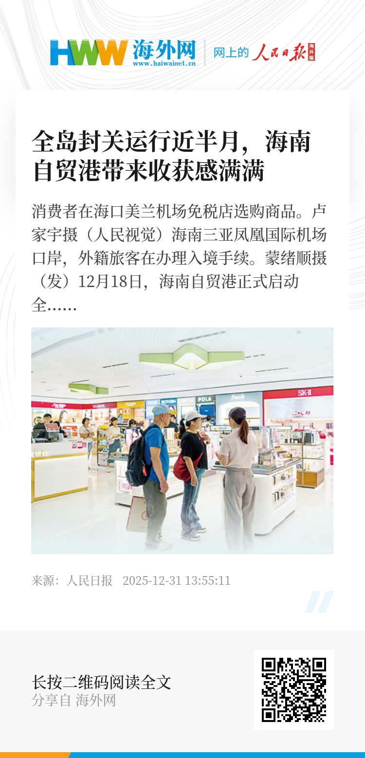 12月18日,海南自贸港正式启动全岛封关,迈向更高水平对外开放新阶段,一系列惠企利民政策扩容落地。封关运行将近半月,消费者在免税店内刷新购物体验;外国来华工作者爱上在海南的工作和生活;岛内本土企业迎来发展新机遇;外资企业看好在中国的发展未来。