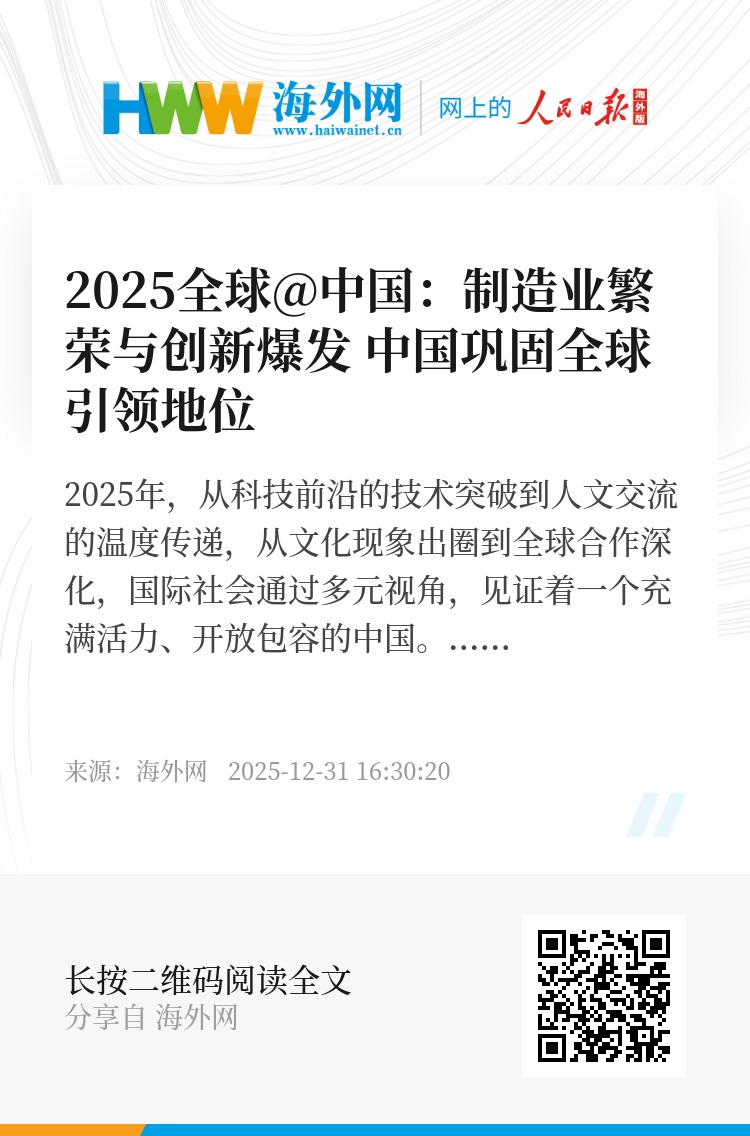 2025年的中国,以创新为翼、以交流为桥、以合作为基,在全球舞台上书写着发展奇迹。国际社会的积极评价,既是对中国成就的认可,更是对未来合作的期许。欧洲《现代外交》杂志认为中国从“中国制造”向“中国创新”转型成效显著,为全球增长注入新动能;南非独立传媒也称赞,中国是值得信赖的合作方,发展经验惠及多国,合作共赢潜力持续释放。这份创新活力与合作诚意,将继续驱动中国稳步前行,为世界带来更多发展机遇,让双向奔赴的共赢之路越走越宽。(海外网 侯兴川)