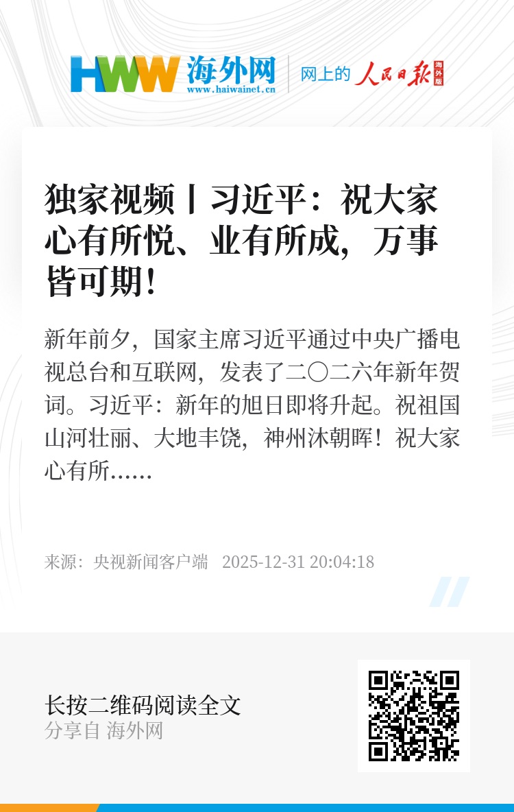 新年前夕,国家主席习近平通过中央广播电视总台和互联网,发表了二〇二六年新年贺词。
