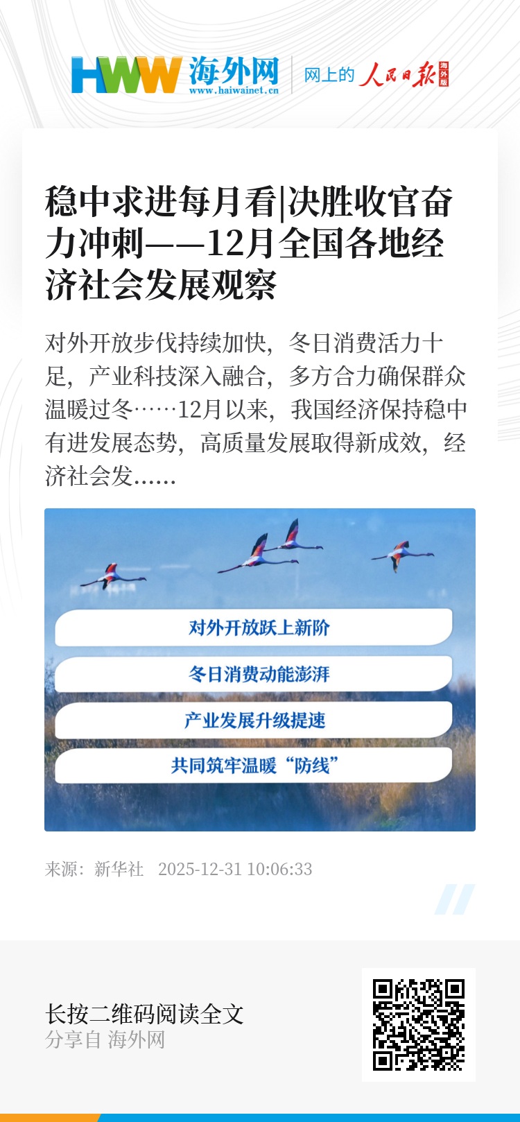 对外开放步伐持续加快,冬日消费活力十足,产业科技深入融合,多方合力确保群众温暖过冬……12月以来,我国经济保持稳中有进发展态势,高质量发展取得新成效,经济社会发展信心和动力不断增强。
