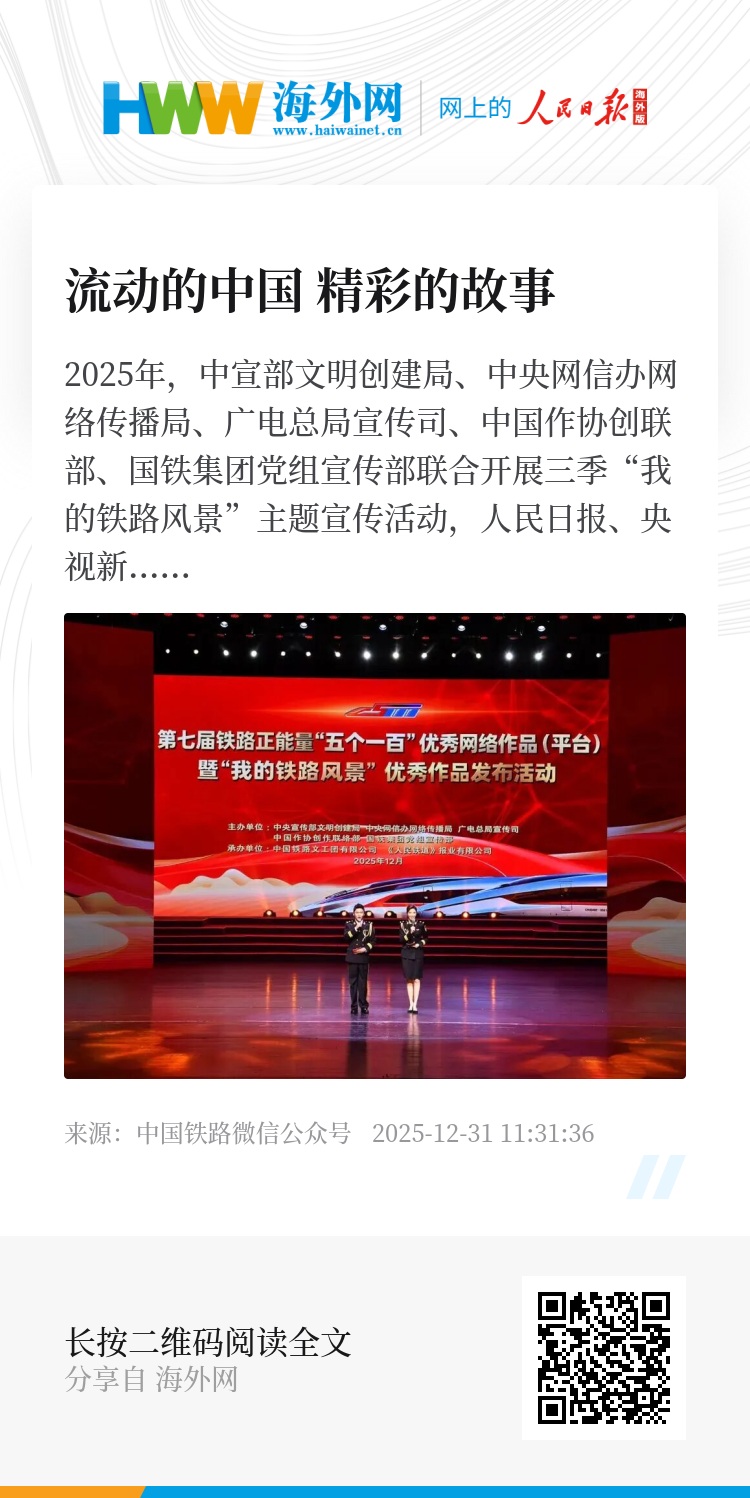 2025年,中宣部文明创建局、中央网信办网络传播局、广电总局宣传司、中国作协创联部、国铁集团党组宣传部联合开展三季“我的铁路风景”主题宣传活动,人民日报、央视新闻、新华网客户端、学习强国、中国文明网,抖音、微博、小红书和“中国铁路”全媒体等20余个平台倾力承办,共征集到原创作品76万余个,展示传播7万余个,话题传播量超90亿人次。