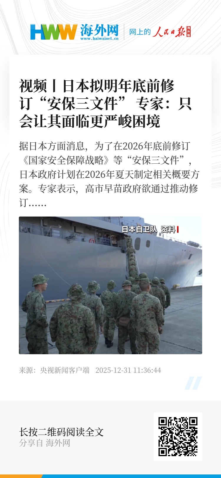 中国社科院日本研究所政治研究室助理研究员 孟明铭:高市早苗政府加速推动修订“安保三文件”,这一举措绝非简单的政策调整,而是日本安保战略的一次根本性的转向。以高市为代表的日本右翼势力,其核心的战略意图是推动日本突破战后专守防卫原则的束缚。不仅违背了日本的和平宪法精神,增加了日本民众的经济负担,更会使中日关系乃至亚太地区的安全环境更加复杂化,只会让日本面临更加严峻的安全困境。