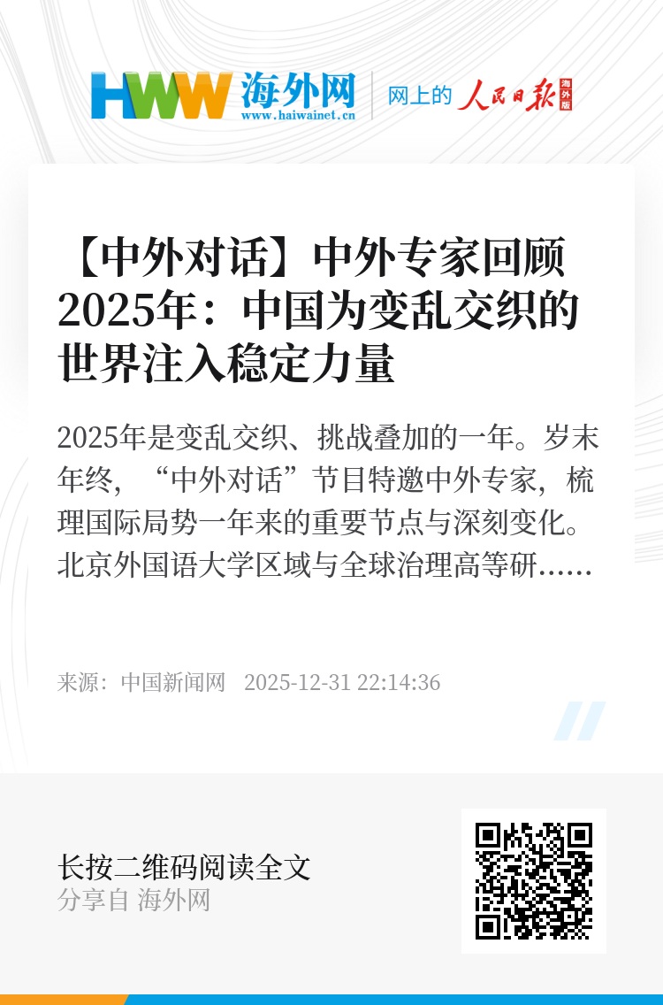 2025年是变乱交织、挑战叠加的一年。岁末年终,中新网“中外对话”节目特邀中外专家,梳理国际局势一年来的重要节点与深刻变化。
