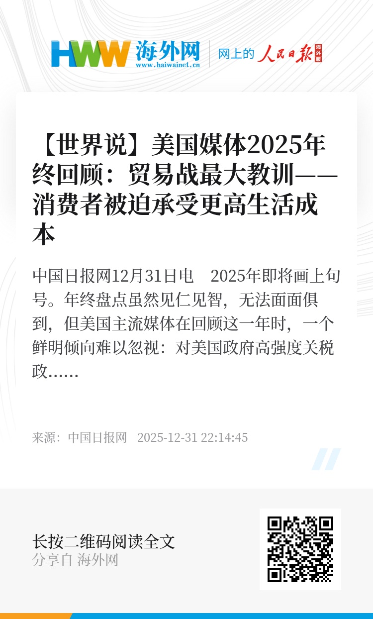 中国日报网12月31日电 2025年即将画上句号。年终盘点虽然见仁见智,无法面面俱到,但美国主流媒体在回顾这一年时,一个鲜明倾向难以忽视:对美国政府高强度关税政策的反思与批评。