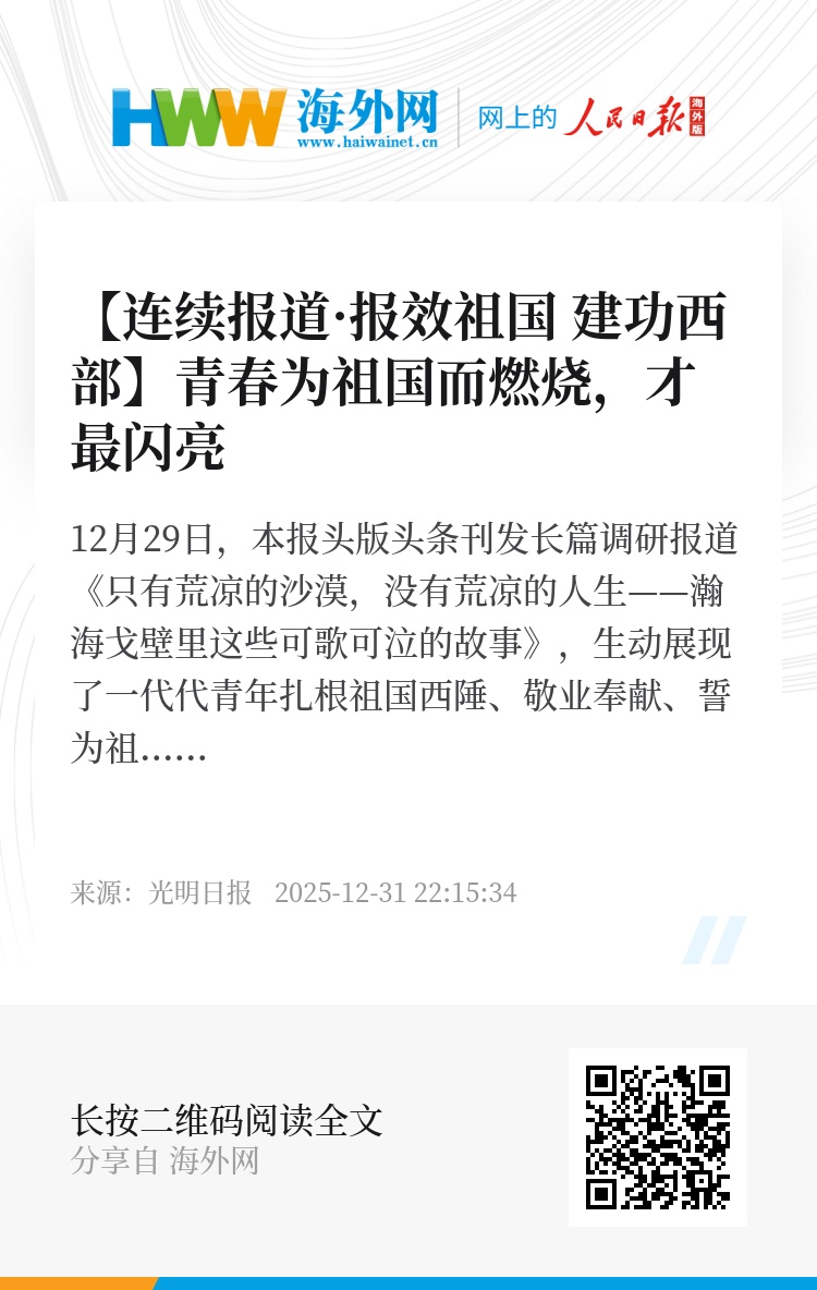12月29日,本报头版头条刊发长篇调研报道《只有荒凉的沙漠,没有荒凉的人生——瀚海戈壁里这些可歌可泣的故事》,生动展现了一代代青年扎根祖国西陲、敬业奉献、誓为祖国献石油的人生选择与火热情怀。
