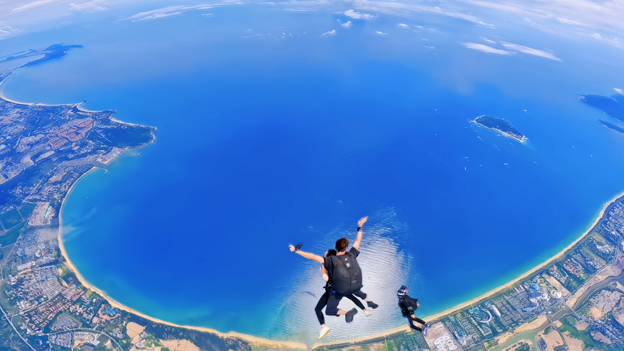 当记者纵身跃出机舱,身体随气流舒展的那一刻,身下的三亚在眼前也铺成一幅立体的画卷:脚下是被阳光镀上金边的海棠湾,椰林如绿色绒毯般铺展,大海蓝得像一块未经雕琢的宝石。