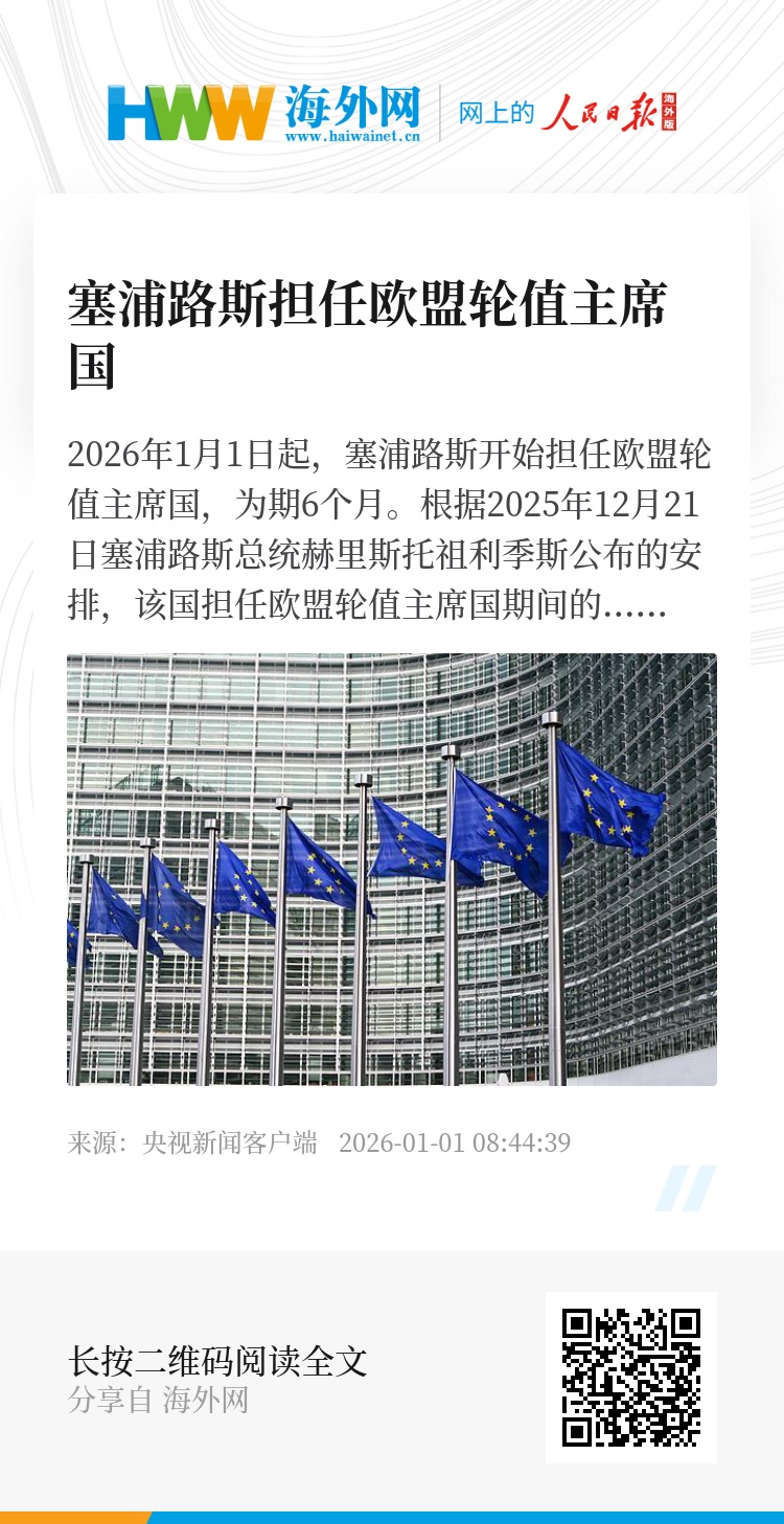 2026年1月1日起,塞浦路斯开始担任欧盟轮值主席国,为期6个月。