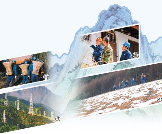 图④:“背篓电工”赶赴故障现场进行抢修。