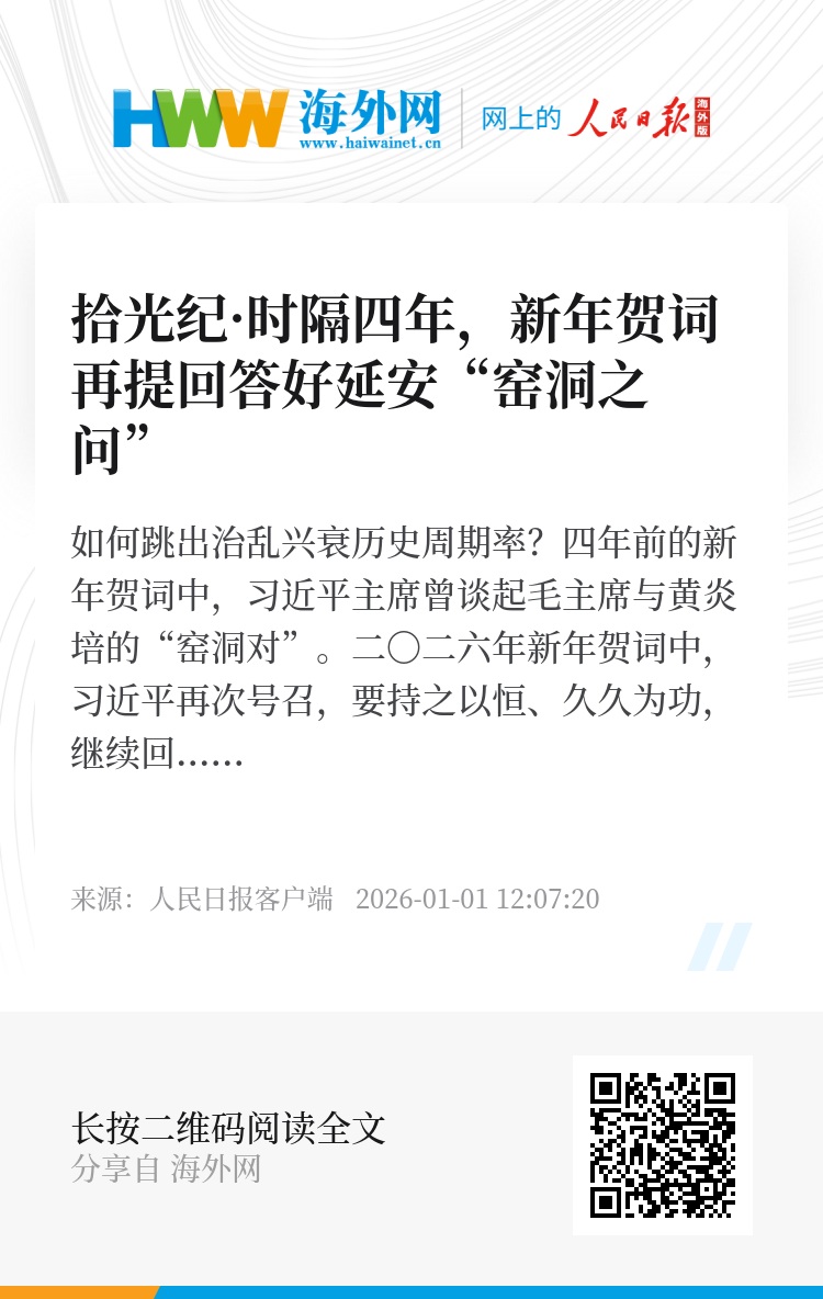 如何跳出治乱兴衰历史周期率?四年前的新年贺词中,习近平主席曾谈起毛主席与黄炎培的“窑洞对”。二〇二六年新年贺词中,习近平再次号召,要持之以恒、久久为功,继续回答好延安“窑洞之问”。
