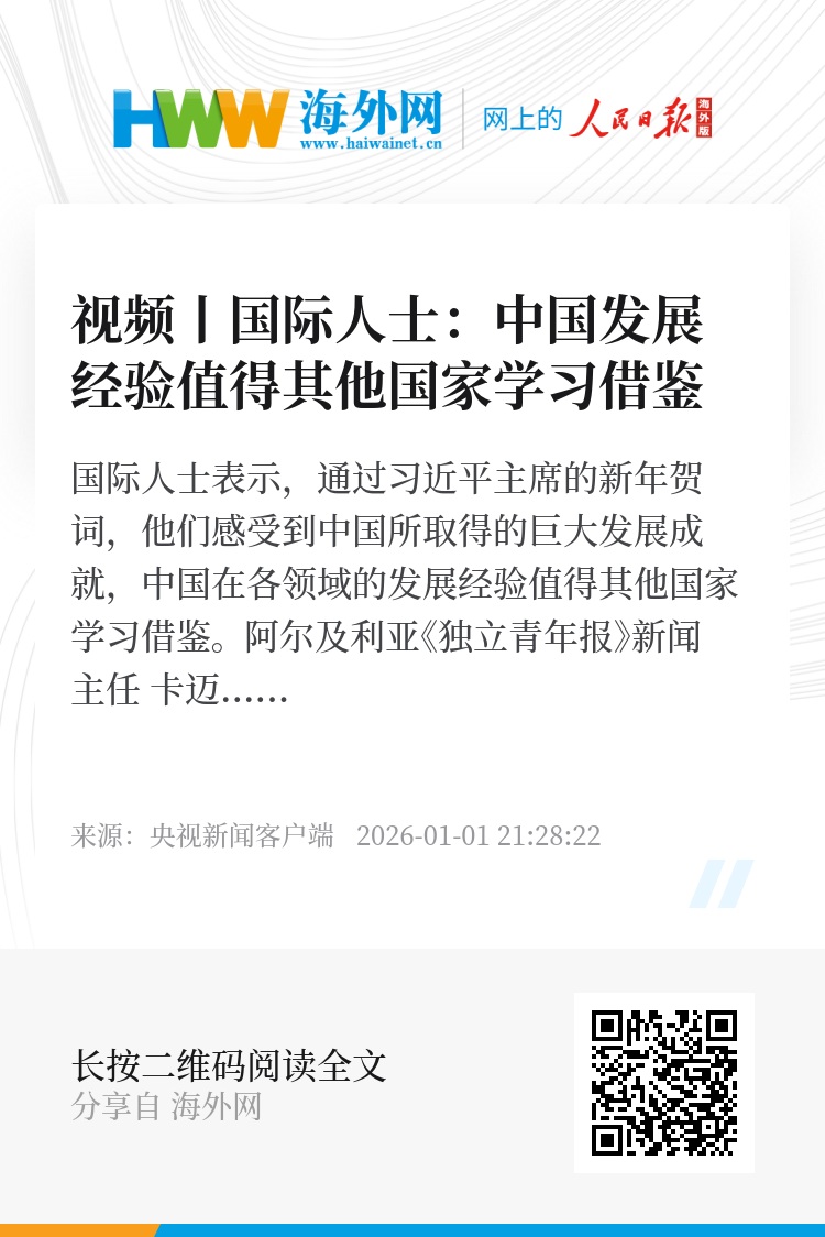 国际人士表示,通过习近平主席的新年贺词,他们感受到中国所取得的巨大发展成就,中国在各领域的发展经验值得其他国家学习借鉴。
