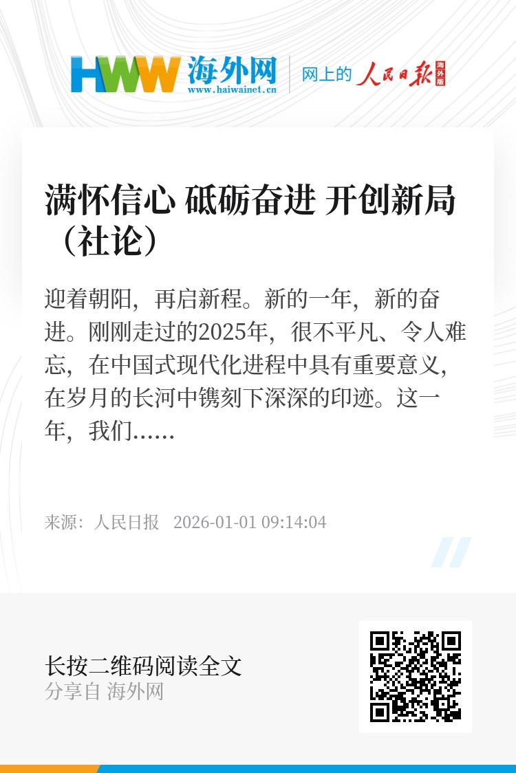 关键时期、承前启后,党的二十届四中全会审议通过“十五五”规划建议,为未来5年中国发展擘画蓝图,也向世界提供了一份“机遇清单”。2026年是“十五五”开局之年,良好的开局是成功的一半。面对深刻复杂变化的环境,面对老问题新挑战,我们要把握发展大势,增强必胜信心,用好“四大优势”,确保“十五五”开好局、起好步,续写经济快速发展和社会长期稳定两大奇迹新篇章。