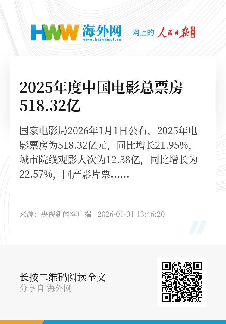 国家电影局2026年1月1日公布,2025年电影票房为518.32亿元,同比增长21.95%,城市院线观影人次为12.38亿,同比增长为22.57%,国产影片票房为412.93亿元,占比为79.67%。