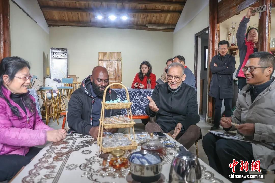 2025年11月17日,穆罕默德·曼苏里(前排右二)跟随“人权行动看中国·2025”江西行活动参访团来到南昌县塔城乡湖陂村乡村振兴示范区,在“新村民”刘红(左一)家中与她面对面交流。刘力鑫 摄