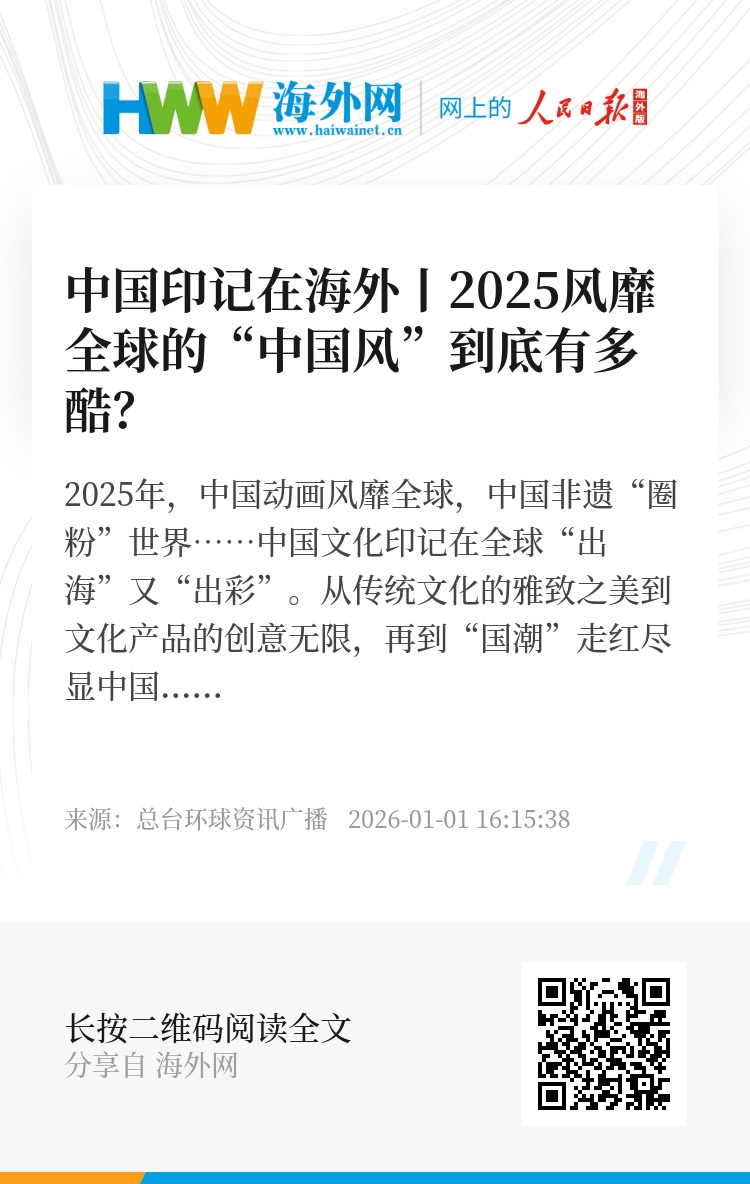 2025年,中国动画风靡全球,中国非遗“圈粉”世界……中国文化印记在全球“出海”又“出彩”。从传统文化的雅致之美到文化产品的创意无限,再到“国潮”走红尽显中国气质,越来越多的海外民众认识和了解中国,爱上中国文化的独特魅力。(策划丨安然 编导丨安然 剪辑丨刘贵虎 包装丨李珊 调色丨杨浩徽 签审丨孙伶俐 监制丨刘轶瑶)