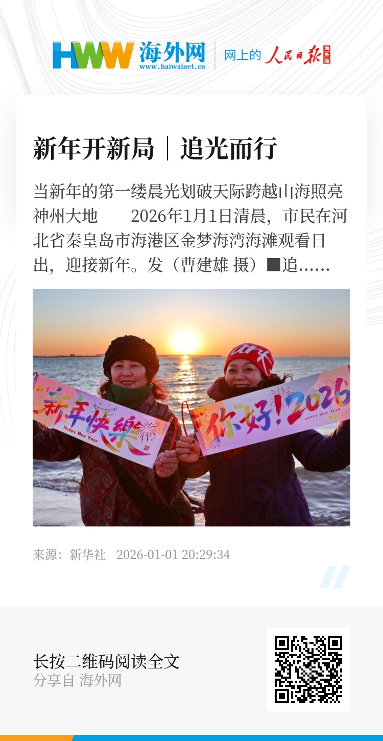 2026年1月1日清晨,市民在河北省秦皇岛市海港区金梦海湾海滩观看日出,迎接新年。新华社发(曹建雄 摄)