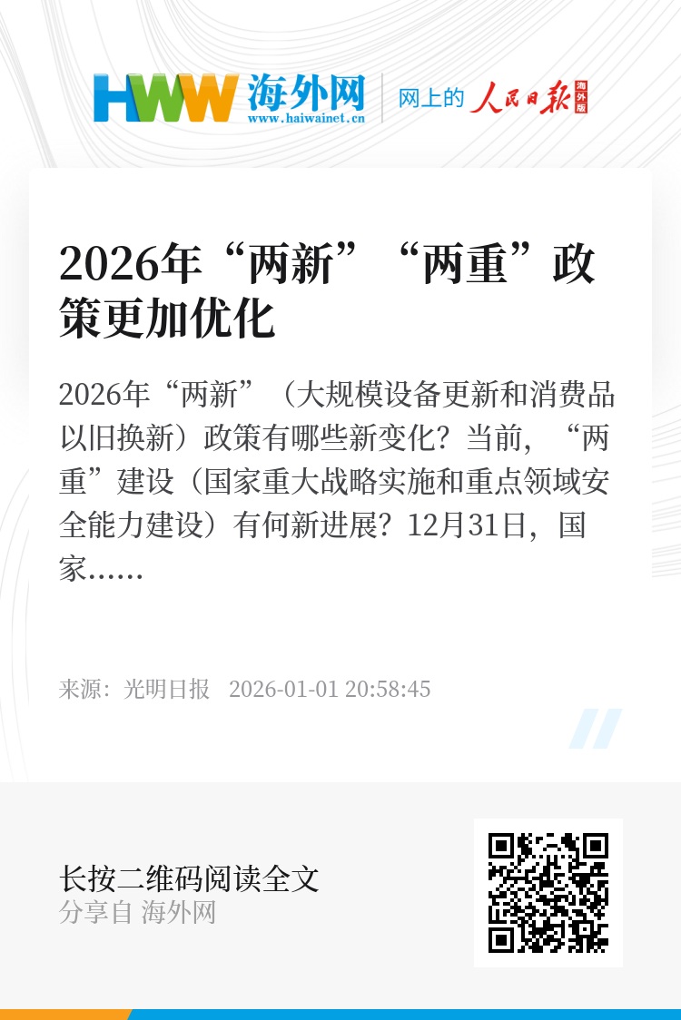 2026年“两新”(大规模设备更新和消费品以旧换新)政策有哪些新变化?当前,“两重”建设(国家重大战略实施和重点领域安全能力建设)有何新进展?12月31日,国家发展改革委举行新闻发布会,围绕相关问题进行了回应。