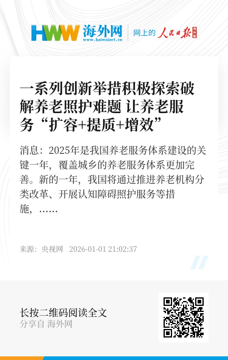 央视网消息:2025年是我国养老服务体系建设的关键一年,覆盖城乡的养老服务体系更加完善。新的一年,我国将通过推进养老机构分类改革、开展认知障碍照护服务等措施,让养老服务扩容提质增效。