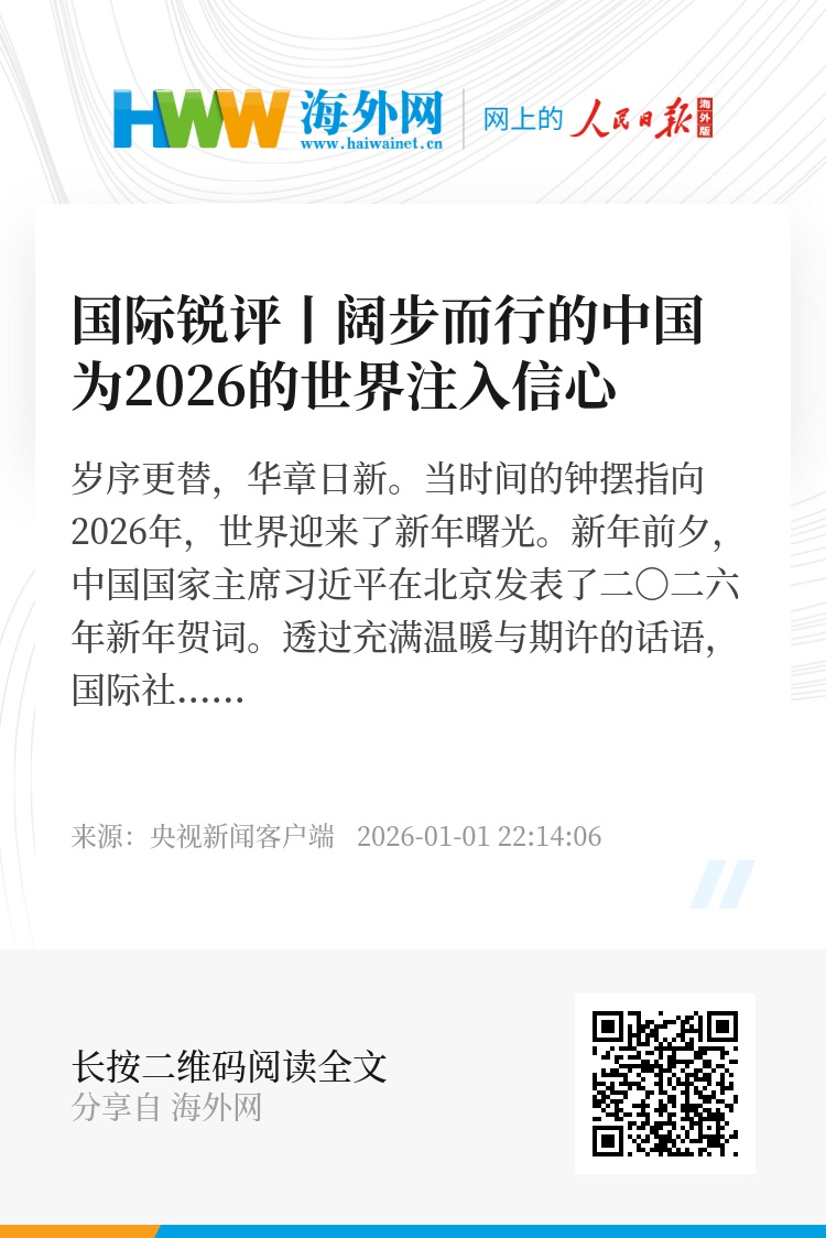 新年前夕,中国国家主席习近平在北京发表了二〇二六年新年贺词。透过充满温暖与期许的话语,国际社会感受到中国阔步而行的奋进姿态、欣欣向荣的发展面貌、开放合作的胸襟格局。国际媒体纷纷聚焦这份新年贺词传递出的中国信心与力量。