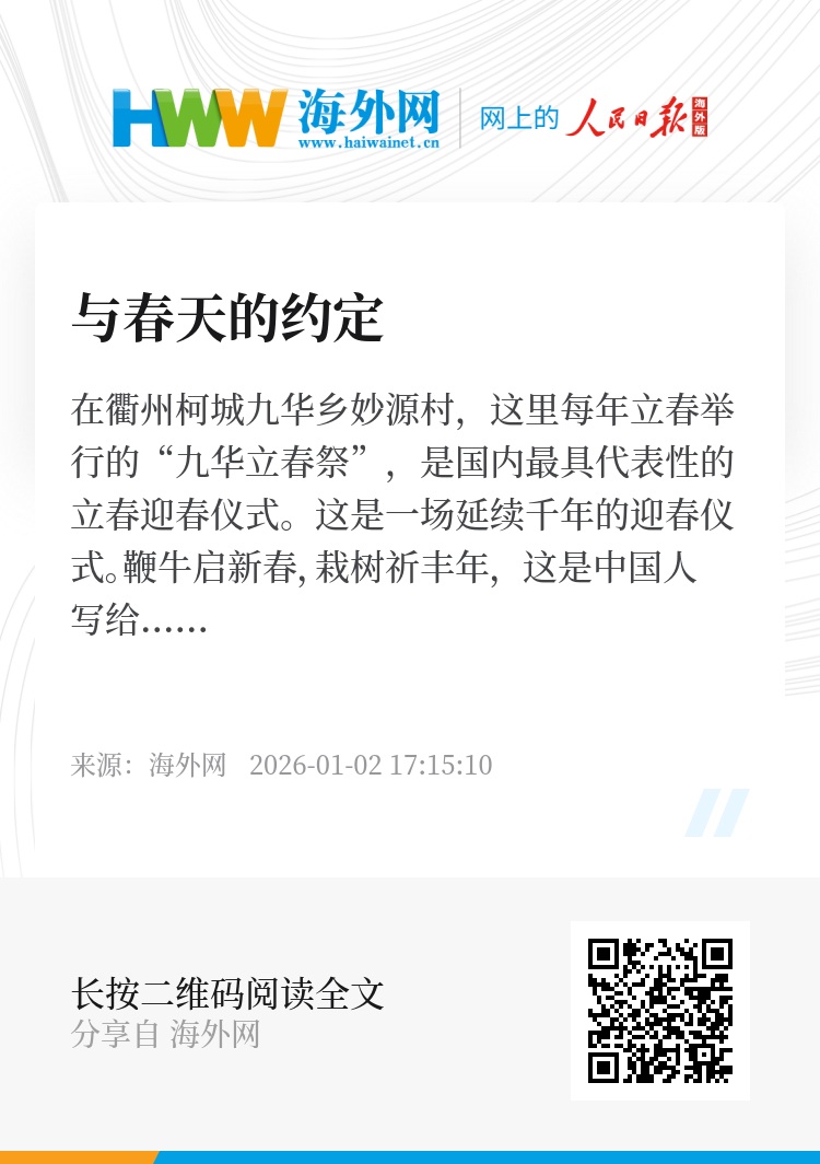 在衢州柯城九华乡妙源村,这里每年立春举行的“九华立春祭”,是国内最具代表性的立春迎春仪式。这是一场延续千年的迎春仪式。鞭牛启新春,栽树祈丰年, 这是中国人写给时光的诗,更是与天地立下的生生之约。2026年,恰逢人类非物质文化遗产·二十四节气(九华立春祭)成功申遗十周年。即日起,2026立春主题系列活动正式拉开序幕。后续,柯城还将陆续开展立春文化交流、九华立春活动、“迎春送福”巡游、“十年之约”影像展等活动,旨在深入挖掘节气文化内涵,推动非物质文化遗产在保护中传承、在交流中发展、在创新中焕发时代生机。期待与您相约在衢州,打开中国的春天。