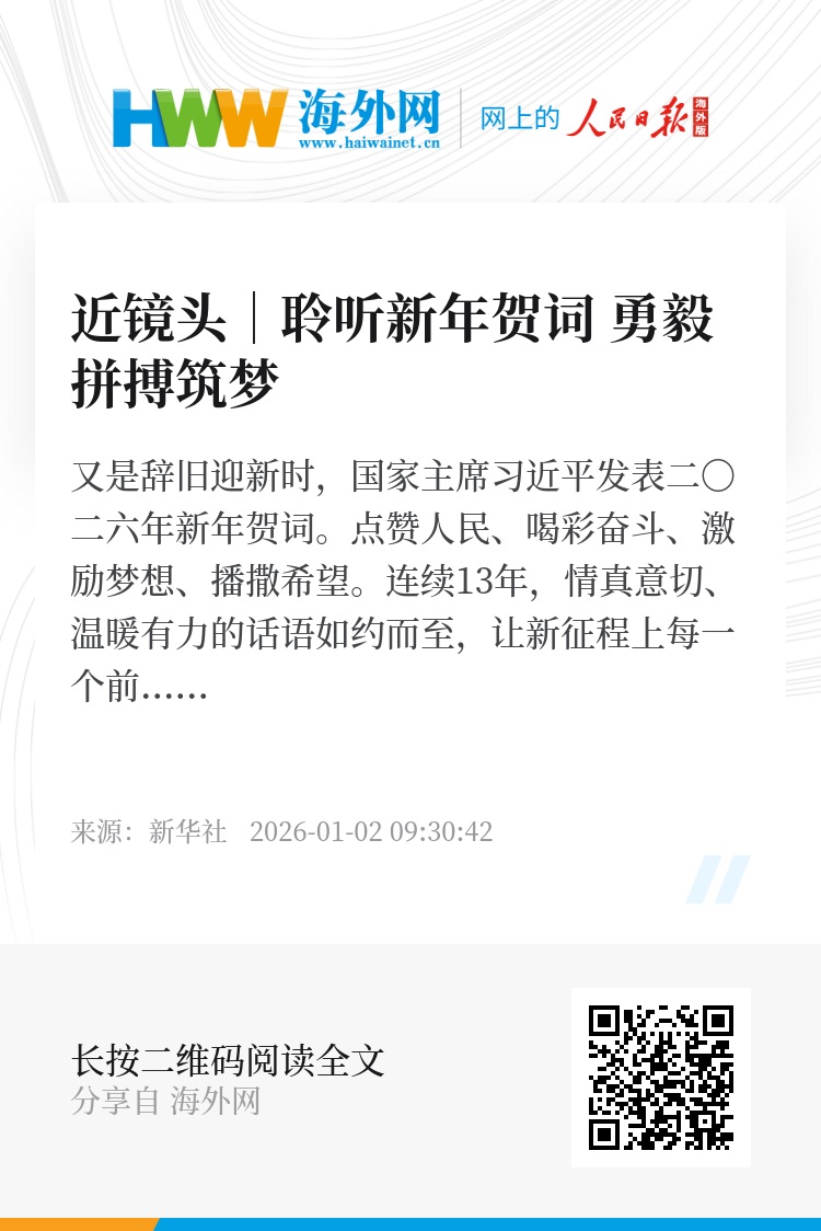 又是辞旧迎新时,国家主席习近平发表二〇二六年新年贺词。点赞人民、喝彩奋斗、激励梦想、播撒希望。连续13年,情真意切、温暖有力的话语如约而至,让新征程上每一个前行者信心满怀,每一个奋斗者的脚步沉稳有力。