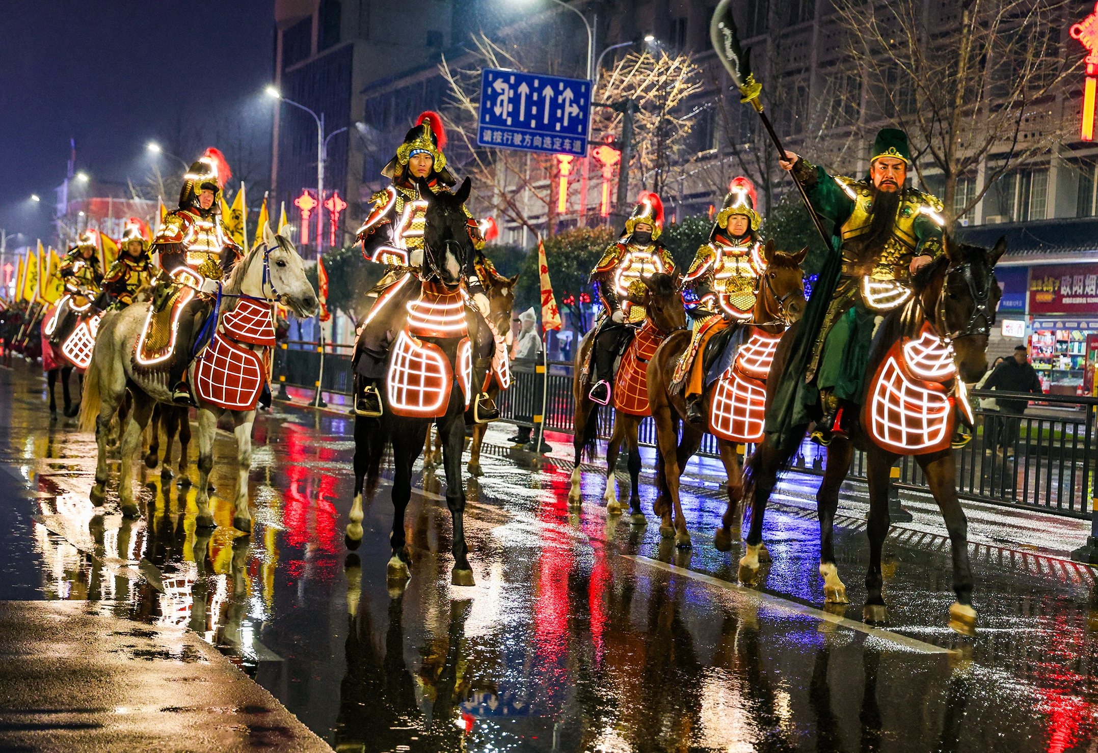 身披金甲的“关羽”将军策赤兔马飒沓而来,99名“蜀国将士”高擎龙纹战旗,再现三国古战场的雄浑气象。