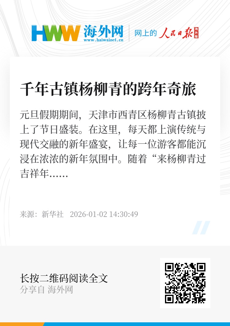元旦假期期间,天津市西青区杨柳青古镇披上了节日盛装。在这里,每天都上演传统与现代交融的新年盛宴,让每一位游客都能沉浸在浓浓的新年氛围中。