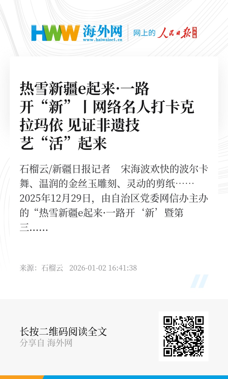 从传承人指尖的坚守到网络名人镜头下的传播,非遗技艺正跨越时空,在新时代的沃土上焕发出蓬勃生机,成为讲好新疆故事、彰显文化自信的亮丽名片。