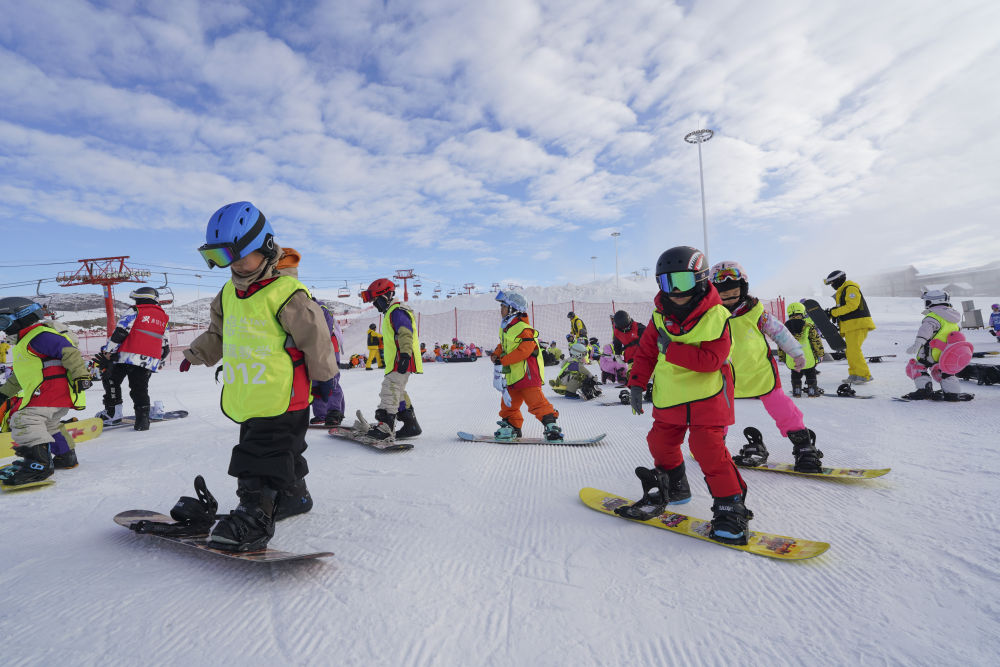 2025年12月1日,学生在阿勒泰将军山国际滑雪度假区练习单板滑雪。新华社记者 阿曼 摄
