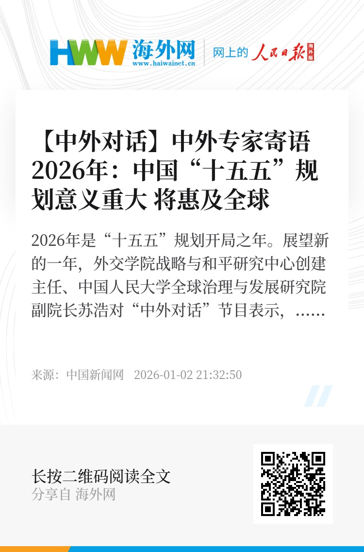 2026年是“十五五”规划开局之年。展望新的一年,外交学院战略与和平研究中心创建主任、中国人民大学全球治理与发展研究院副院长苏浩对中新网“中外对话”节目表示,中国作为世界第二大经济体,其经济发展既拥有稳定基础与广阔进步空间,也为世界经济提供重要动力与稳定支撑。《地缘政治经济报告》创始人、美国外交政策专家贲杰民·诺顿(Benjamin Norton)也指出,“十五五”规划不仅对中国至关重要,对世界也意义重大。中国在科技创新等方面的贡献,不仅造福本国人民,也惠及全球民众。(管娜 甘甜 赵丽)