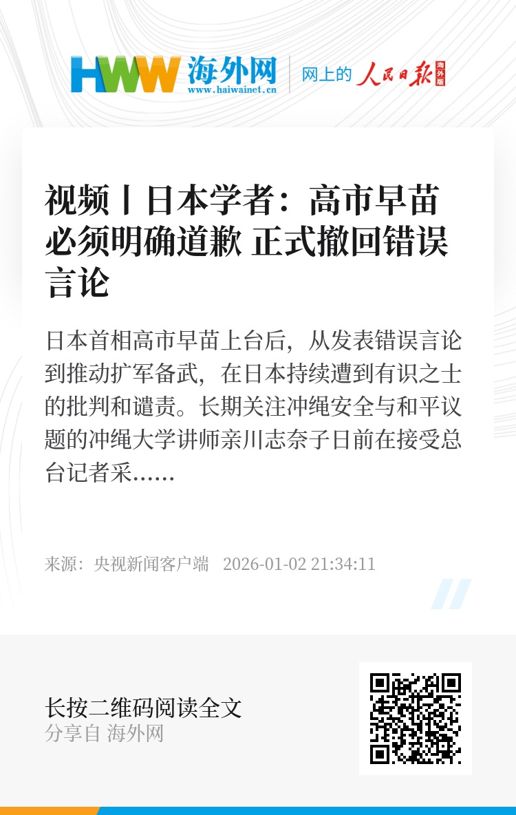 日本首相高市早苗上台后,从发表错误言论到推动扩军备武,在日本持续遭到有识之士的批判和谴责。长期关注冲绳安全与和平议题的冲绳大学讲师亲川志奈子日前在接受总台记者采访时表示,高市的错误言论充满煽动性和攻击性,严重背离和平宪法精神,也给日本国民带来恶劣后果。高市早苗必须明确道歉,正式撤回相关发言。