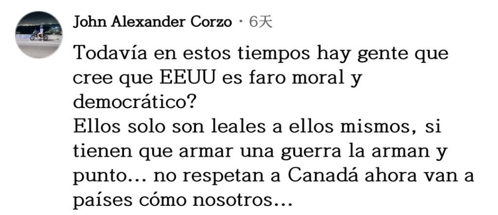 网友约翰·科尔索坦言道:“时至今日,还有人相信美国是道德和民主的灯塔吗?他们只忠于自己,如果需要发动一场战争,他们随时会发动,仅此而已!他们连加拿大都不尊重,现在矛头对准我们这样的国家了。”