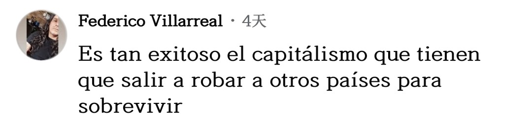 网友费德里科·比利亚雷亚尔不禁感慨道:“资本主义如此成功,以至于他们必须去抢劫其他国家才能生存下去。”