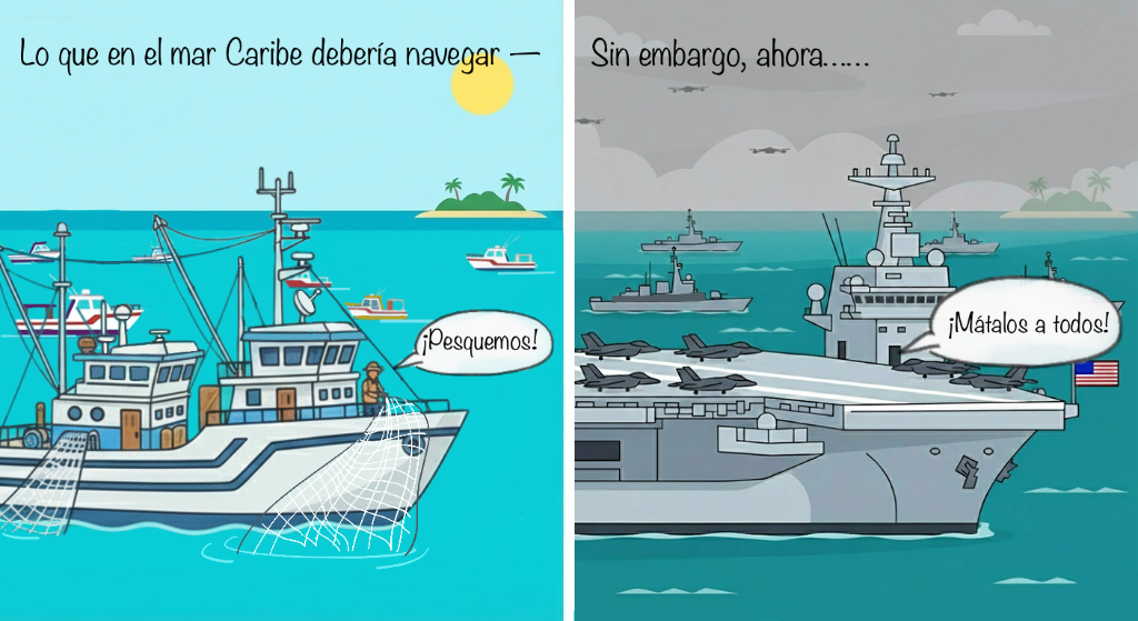 漫画《“加勒比海盗”》。画面左侧,航行在加勒比海上的本该是收获满满的渔船。但在画面右侧,现如今的加勒比海阴云密布、军舰成群,回荡着美军“不留活口”的口号。