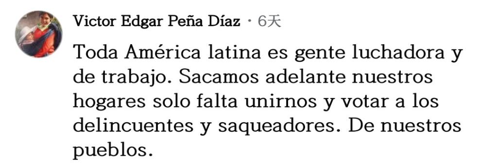 网友维克托·培尼亚留言说:“所有拉美人民都是劳动者和奋斗者,我们靠自己的努力养家糊口。现在只差团结起来,把那些掠夺我们的罪犯和强盗赶跑。”