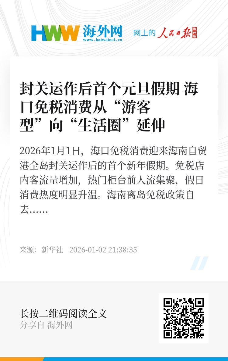 封关运作后的首个元旦假期,海口免税消费的新热度与新秩序正在同框呈现,折射出海南离岛免税市场在场景、客群与服务层面的持续升级。