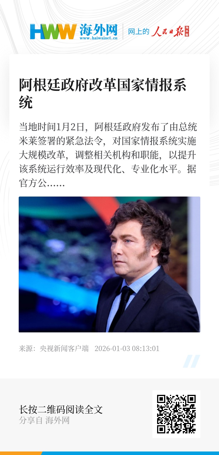 当地时间1月2日,阿根廷政府发布了由总统米莱签署的紧急法令,对国家情报系统实施大规模改革,调整相关机构和职能,以提升该系统运行效率及现代化、专业化水平。