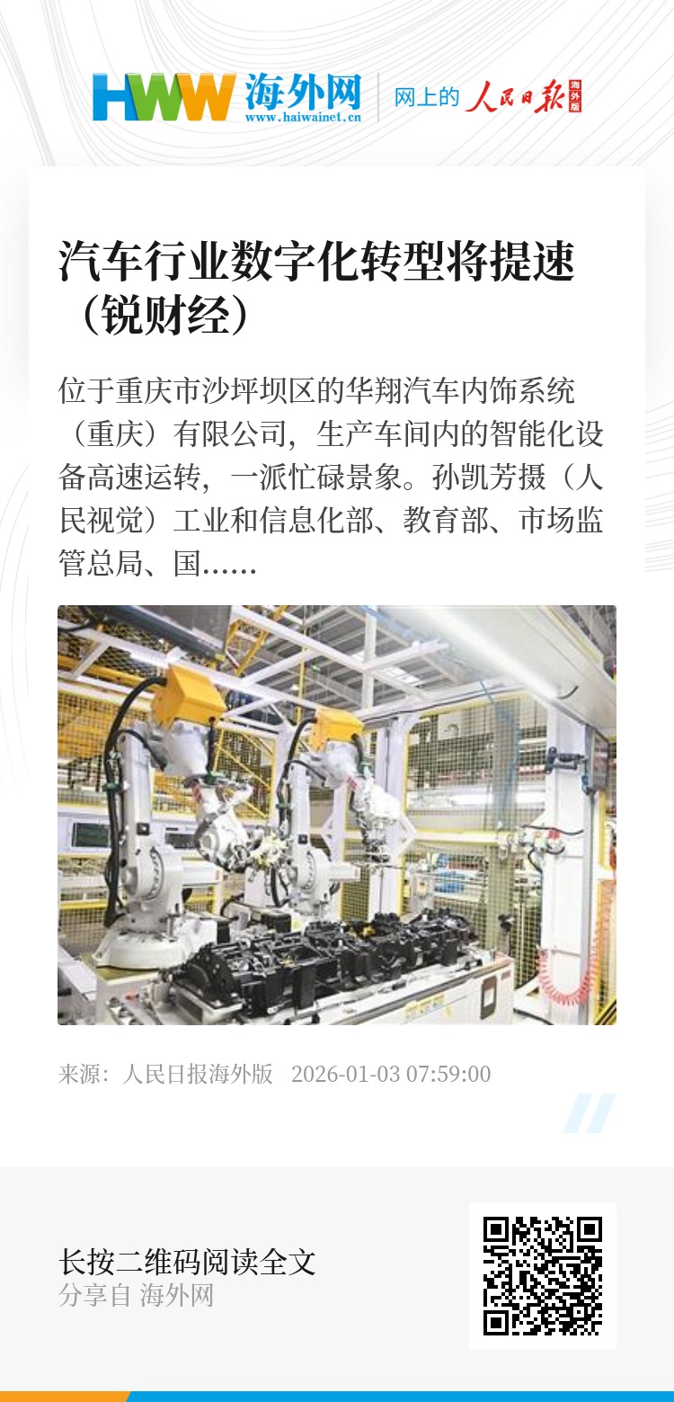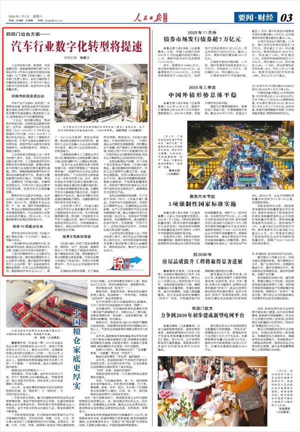“十五五”规划建议提出“推动技术改造升级,促进制造业数智化转型”。近年来,《新能源汽车产业发展规划(2021—2035年)》《汽车行业稳增长工作方案(2025—2026年)》等文件先后出台,推进人工智能技术深度应用,引导产业链供应链数字化协同改造,我国汽车行业数字化转型持续深化,加速向数字化、网络化、智能化演进。