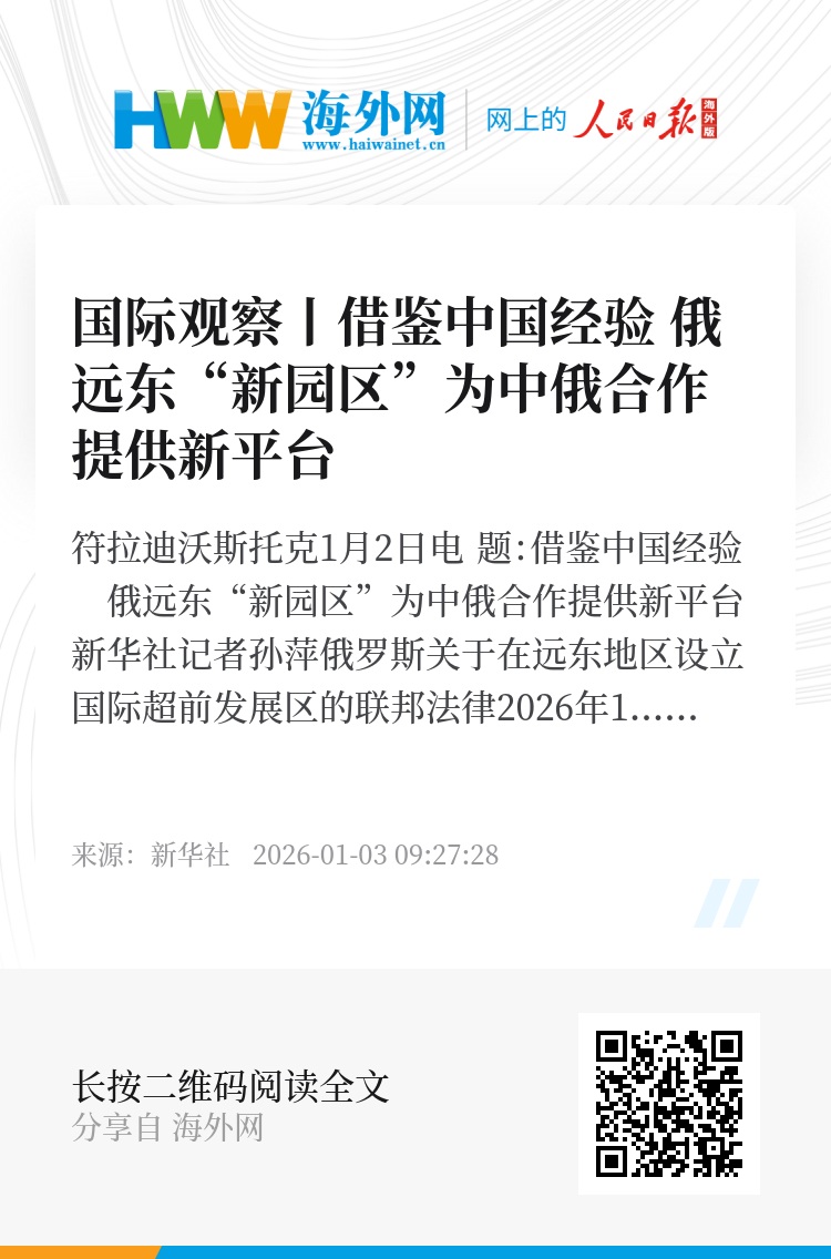 分析人士解读,国际超前发展区以优惠政策吸引外国投资,意在为俄远东地区对外合作和经济发展开辟新前景。这一政策借鉴中国经验,将为中俄合作提供新平台。