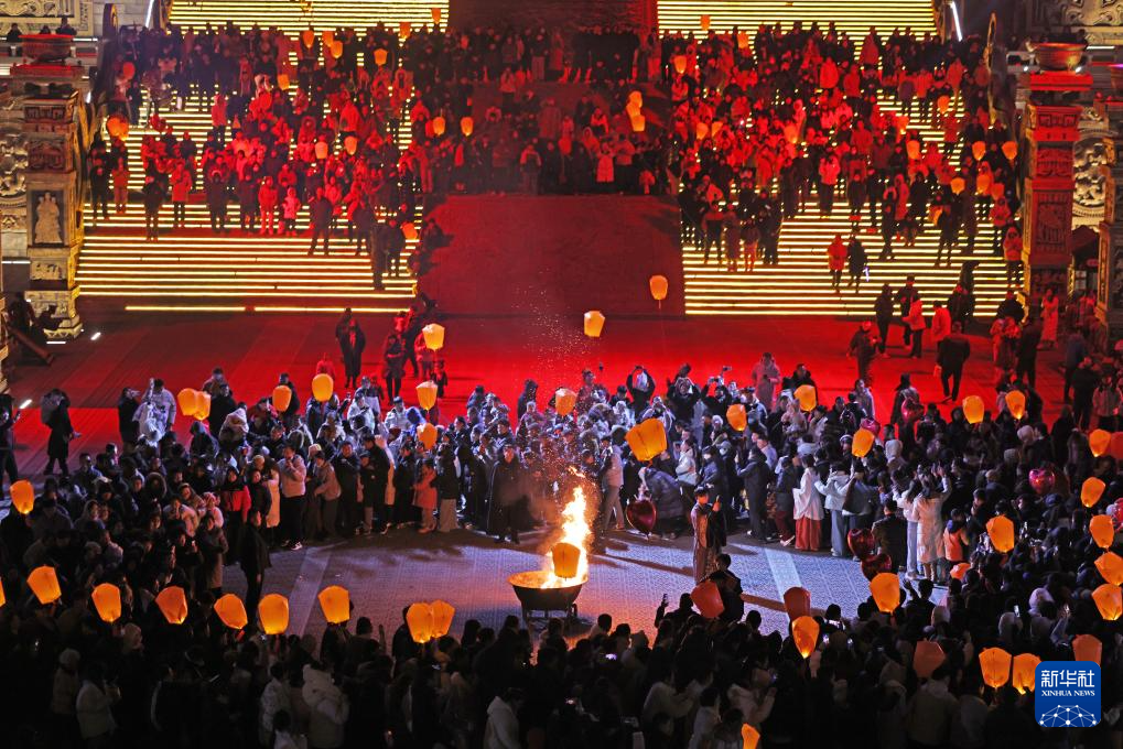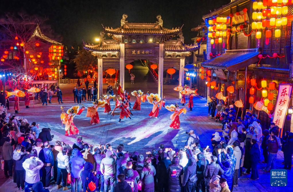 1月1日,游客在山东乐陵影视城景区观看表演(无人机照片)。新华社发(贾鹏 摄)