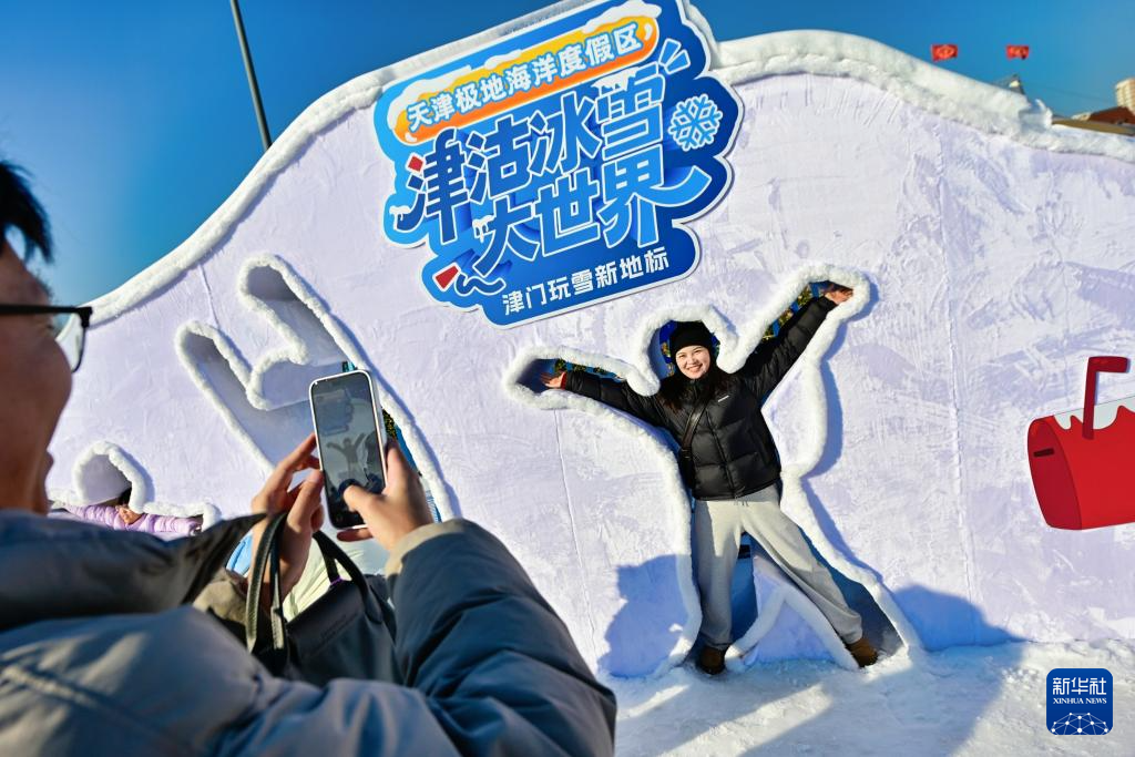 1月2日,游客在天津市滨海新区极地海洋度假区拍照打卡。新华社发(杜鹏辉摄)